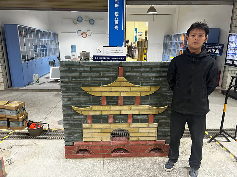 砌筑项目(世赛选拔)竞赛时长6.5个小时,分两天进行,选手需按照放样切割,完成墙面和小型台阶的镶贴。经过激烈角逐,选手需完成识图放样、切割、测量、抹灰、砌筑、找平、勾缝等实操环节,丁尚明同学手中不断翻转、舞动着各式各样的测量仪器,凭借精心设计与操作,以砖为具,巧手筑画,高标准完成参赛作品,以总分91.2的绝对优势将砌筑项目(世赛选拔)第一名收入囊中。
