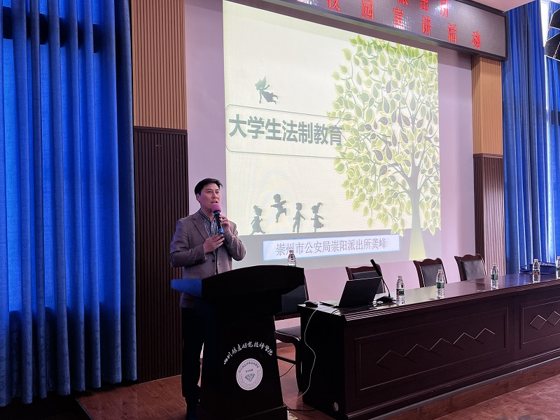 崇州市公安局崇阳派出所民警龚峰结合多年的工作经验,根据我院学生的实际情况出发,从加强学生法制教育的迫切性、学生常见违法犯罪行为、学生犯罪的原因和预防等四个方面给同学们进行普法宣传。他给同学们带来了通俗易懂、简单实用的法律知识,解读了一个个生动鲜活、触目惊心的青少年犯罪案例,联系实际,以案释法,以法论事,可谓是学校法制教育的一次“雪中送炭”。