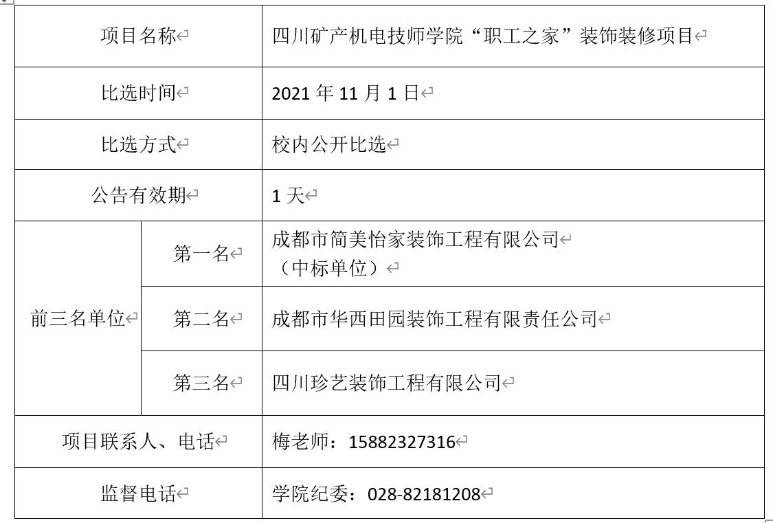 四川矿产机电技师学院“职工之家”装饰装修项目比选结果公告