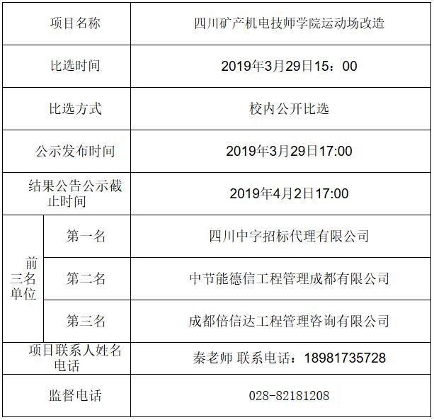 四川矿产机电技师学院运动场改造代理单位比选结果公示