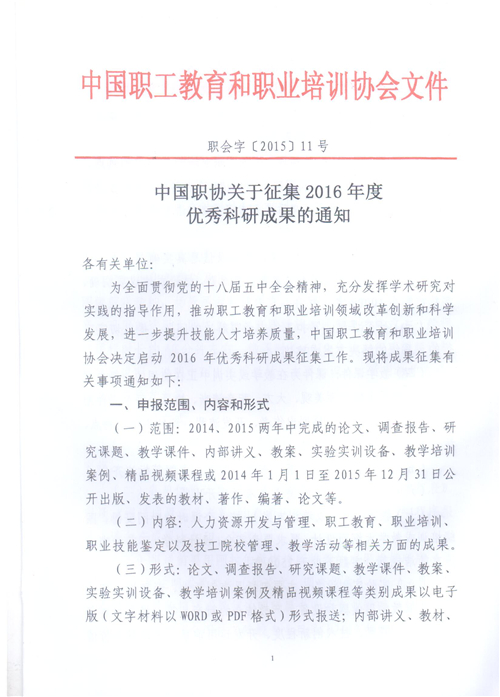 关于第十五届全国技工院校 实验实训设备类优秀科研成果评选工作 具体安排的通知