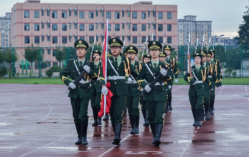仪式在嘹亮的国歌声中拉开帷幕。国旗护卫队迈着坚定有力的步伐护送国旗至升旗台,擎旗手迎风振臂,熟练有力地将国旗向空中展开,五星红旗冉冉升起,迎风飘扬。参与仪式的师生们用最真挚的祝福表达着对祖国的崇敬与热爱。