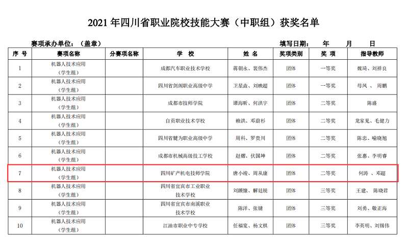 4月23日-24日,2021年四川省职业院校技能大赛(中职组) “工业机器人技术应用”赛项在四川省蒲江县职业中专学校举行,来自全省21支代表队参赛。经过两天的激烈角逐,在我院机电工程系何涛、邓超两位老师指导下,唐小俊、周从康两位同学沉着应战、出色发挥,喜获全省二等奖。