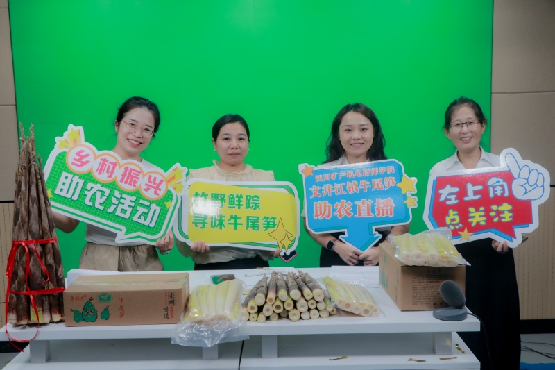 依托现代服务产业学院项目,积极响应助农号召,拓宽农产品销售渠道、助力乡村产业振兴,9月17日下午,经济管理系 “鲜美牛尾笋 自然好滋味” 助农行动开播仪式在学院智能楼303 演播室成功举行。学院副院长郑常翔、文井江镇政府经办副主任高靖淑、鸡冠山村党总支书记、村委会主任王英应邀出席,学院师生及相关工作人员共同参与此次活动。学院经济管理系副主任赵娜主持活动。