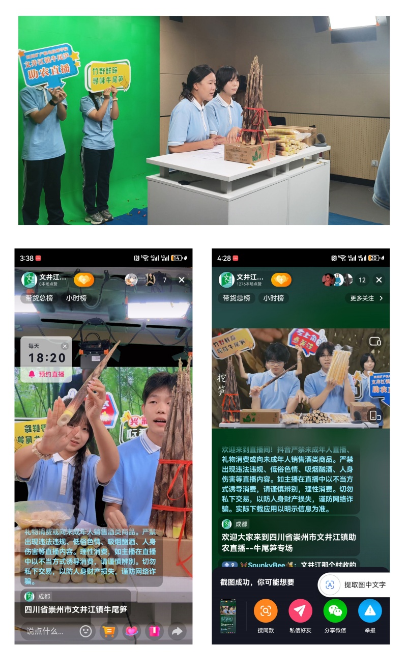 直播结束,学生们脸上满是收获的笑容——不仅帮农户卖出近百单笋,更锻炼了沟通、营销实战能力。对文井江镇农户来说,这场直播是打开市场的“金钥匙”,让优质农产品被更多人看见。