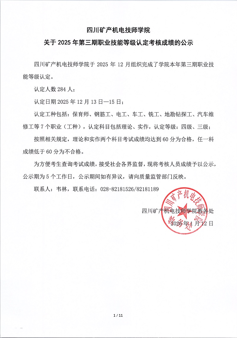 四川矿产机电技师学院关于2025年第二期职业技能等级认定考核成绩的公示