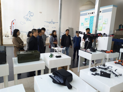 双方座谈结束后,传媒学院与会领导及专业老师带领我们参观了无人机应用实训中心,了解到目前教学上常用的无人机机型及教学开展环节。期间,双方还就学生校外实训、专业服务产业、促进地方经济发展相关方面进行了交谈。