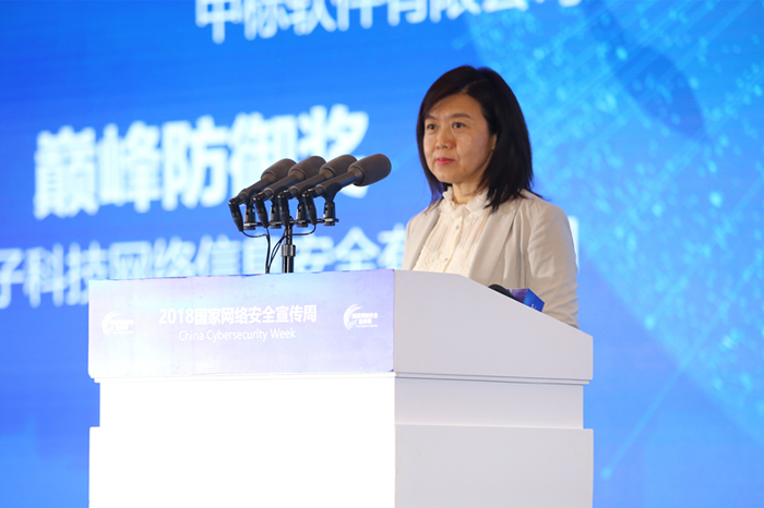图为阿里巴巴集团首席风险官郑俊芳就《创新安全,护航数字经济》发表演讲。中国网信网 李旭 摄