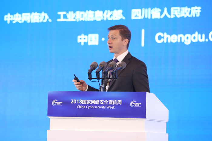 图为卡巴斯基实验室全球亚太区公共事务负责人奥列格·阿卜杜拉希托夫就《地缘政治、网络安全、信息透明》发表演讲。中国网信网 李旭 摄