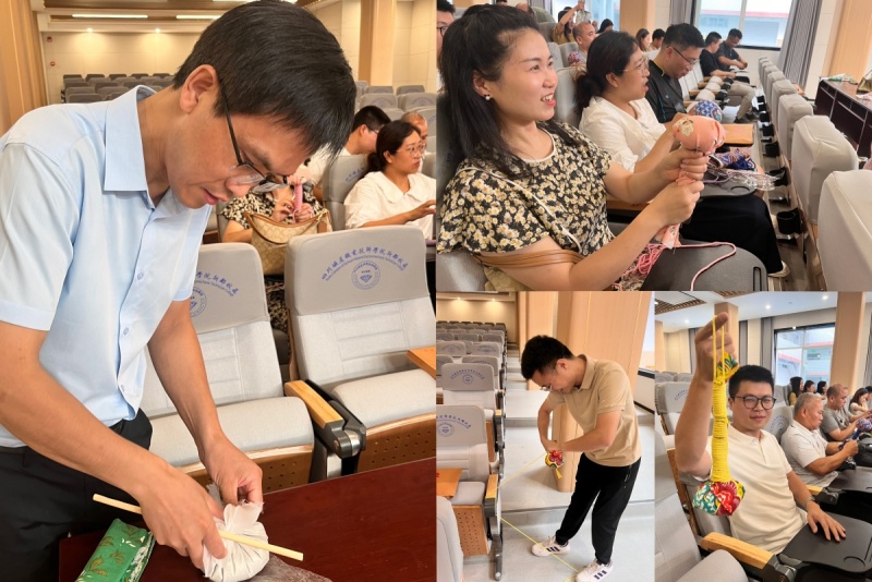 活动伊始,主持人详细讲解了艾草锤的制作步骤。首先,将艾草粉末与填充物混合均匀,以确保艾草粉末能够均匀分布在填充物中,接着用绳子将艾草锤的两端固定,最后完成了一个既美观又实用的艾草锤。在讲解过程中,主持人还穿插了艾草锤的历史背景和文化内涵,让教师们在制作的同时,更深入地了解了中华民族的优秀传统文化。