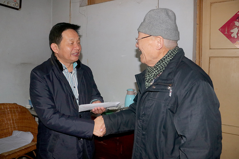 “老人家,身体还好嘛?”一走进位于学院家属区的困难党员杨达贵家中,江元生便握着老人的手,关切地询问对方的身体状况和生活情况,感谢老人为全局和学院事业作出的贡献,提前祝福他新春快乐。杨达贵老人也激动地表示:感谢组织的关心和慰问,虽然已离开工作岗位多年,但仍心系学院,关心学院发展。