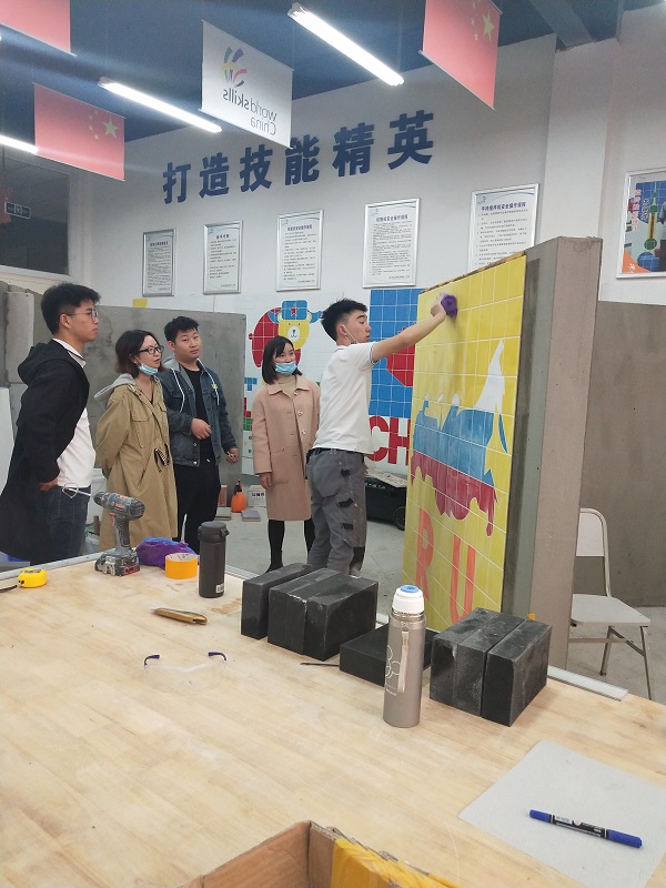 重庆建筑高级技工学校瓷砖贴面项目的教练王老师以及参赛选手热情地接待了我们,不仅带我们参观了他们的训练基地、训练设备,介绍了该项目国赛和世赛的一些规则以及以往参加比赛的经验,而且重庆的参赛选手还给我们演示了整个瓷砖镶贴的比赛过程,整个过程严格按照世赛比赛规则进行,让我们佩服不已,受益匪浅。