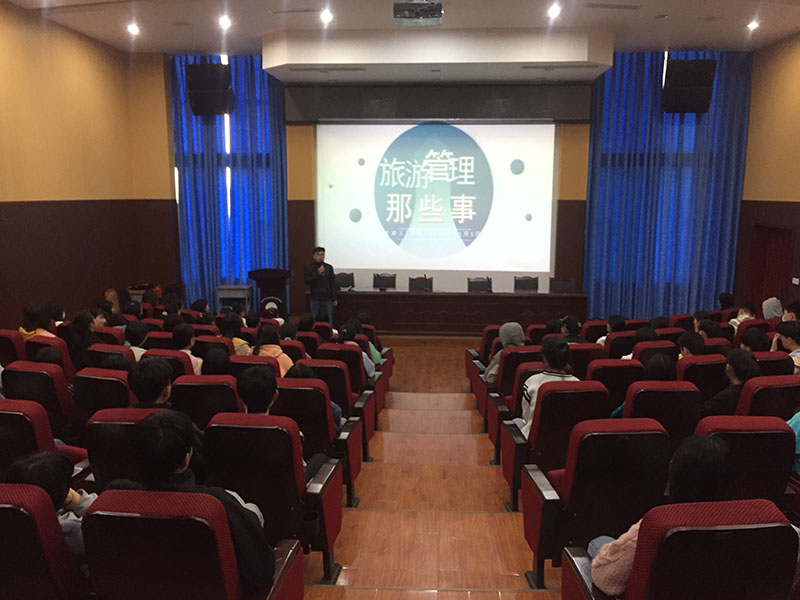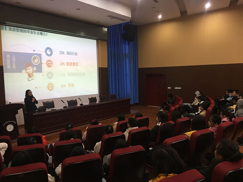四川省十佳导游杨猛老师就“旅游管理能带给学生什么?”进行专题讲解,解答学生关于未来就业前景和专业知识技能方面的困惑;省十佳导游、资深导游刘霞老师就导游业务方面为同学们分享了她从业十年来积累的地陪经验;省十佳导游、洪雅旅游形象大使、携程向导李丹老师就行业前沿旅游+互联网板块进行讲解。