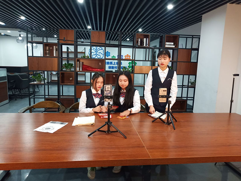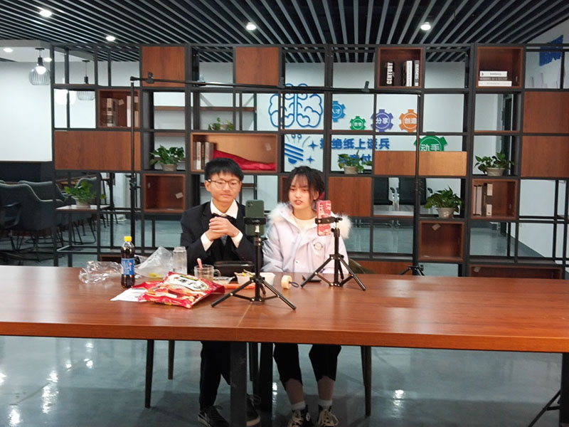 经过现场布置、签到、抽签等一系列准备工作后,每个小组依次进入赛场开始他们的“直播带货”。小组成员们分工合作,“主播”在镜头前推荐产品,场外协助的同学忙着调整镜头、回复评论、传递物品,赛场忙碌而有序。每组选手都在卖力宣传自己的选品,将产品的成分、功能、优点、特色等介绍的头头是道,并现场演示用法,分享用后感受,都进行的有模有样,直播点赞量纷纷破万。