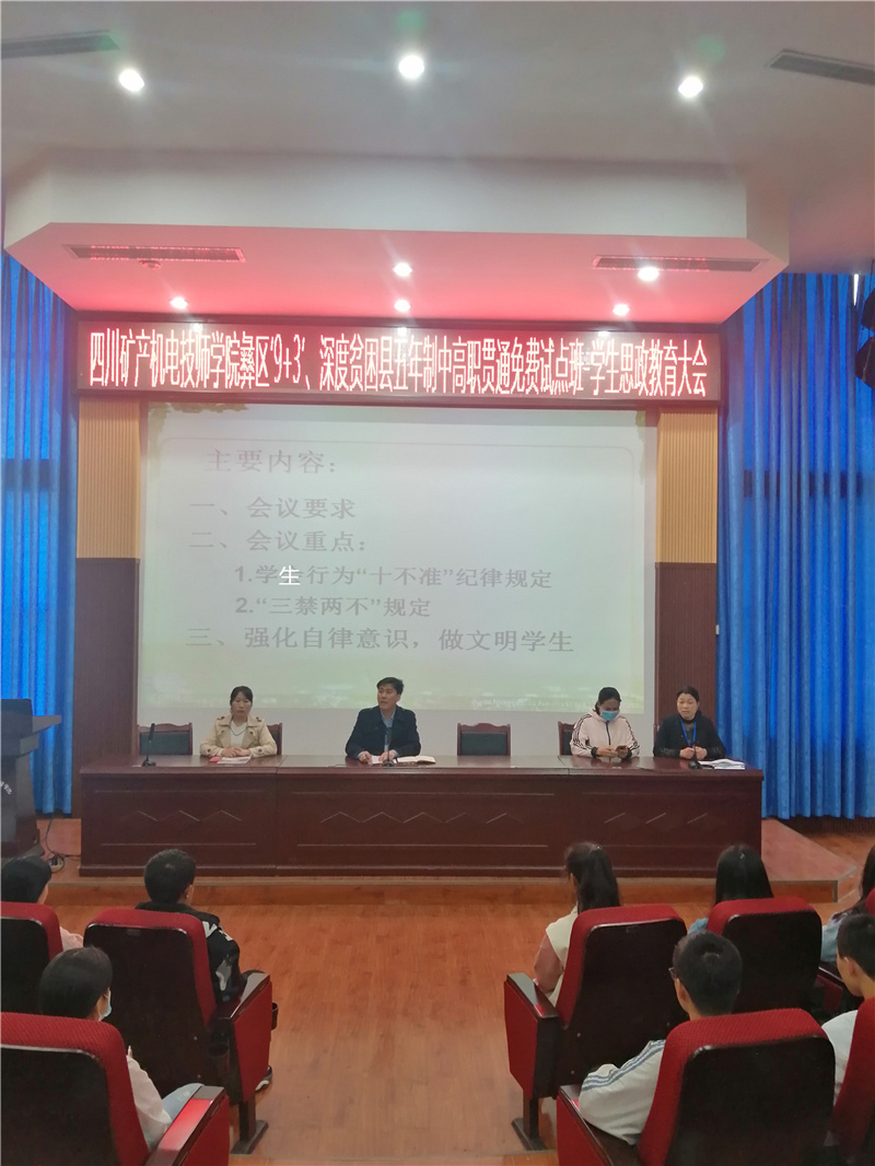 3月18日下午,学院彝区“9+3”、深度贫困县五年制中高职贯通免费试点班思政教育大会在学术报告厅如期举行。学生工作处副处长陈国华、驻校干部丰建、驻校老师张拉则、罗木初及学生工作处王容老师参加大会。