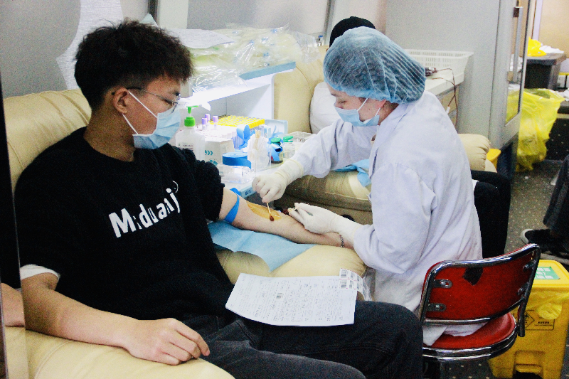 此次献血活动吸引了广大师生的踊跃参与,大家纷纷自愿为社会奉献出自己的一份爱心。献血车一驶入校园,便有很多同学在车前排起了长队等待献血,当医护人员准备好前期工作后,无偿献血活动在工作人员的协调下井然有序的进行,医护人员对前来献血的老师、同学进行了血型、血压、脉搏等各项指标的检测,同时询问其近期用药、作息等状况,从而确保同学们符合献血条件,不会影响正常学习、生活。每名献血人员抽完血后,医护人员为他们送上饼干和热牛奶,并送上暖心关怀,让爱心也温暖着每一位献血人员。一股股青春热血,一颗颗爱心满怀,使得活动现场气氛异常高涨,每个人的心中都充满着献血后的光荣与自豪。