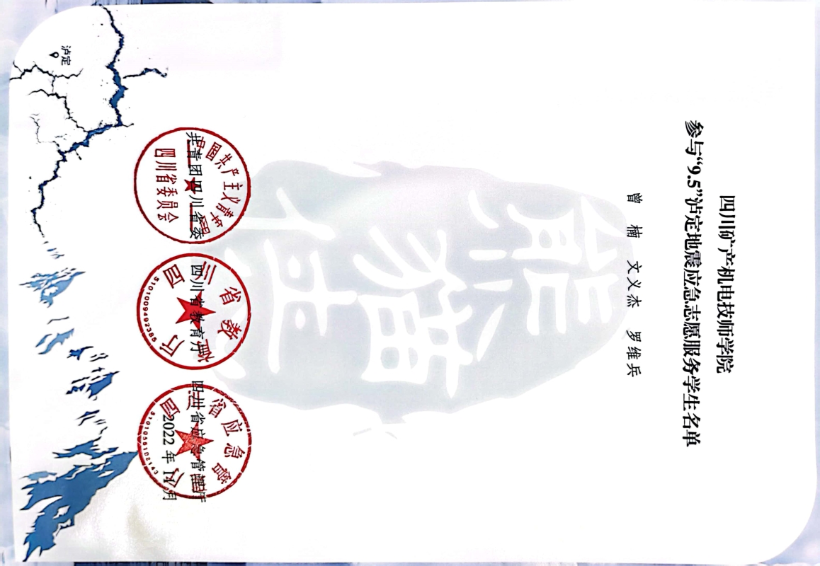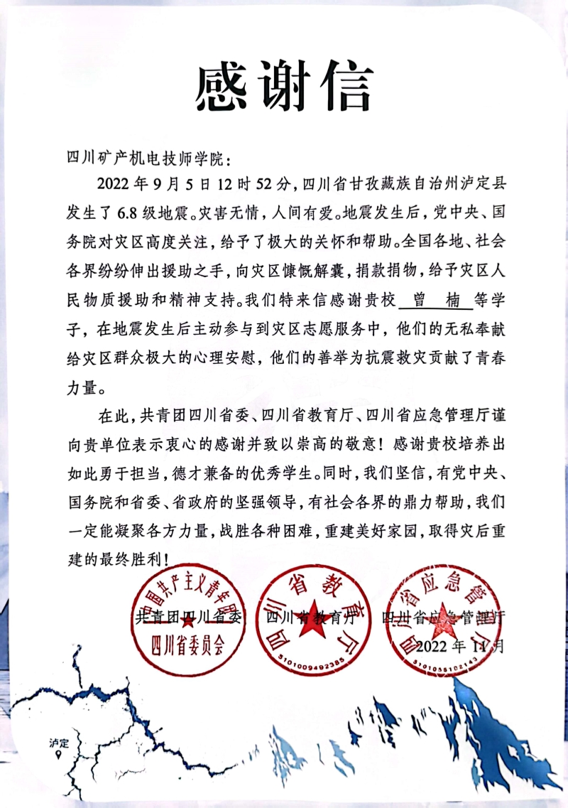 信中对我院三名学生曾楠、文义杰、罗维兵在“9.5”泸定地震发生后主动参与到灾区志愿服务,为当地抗震救灾工作贡献青春力量给予了表扬和感谢。