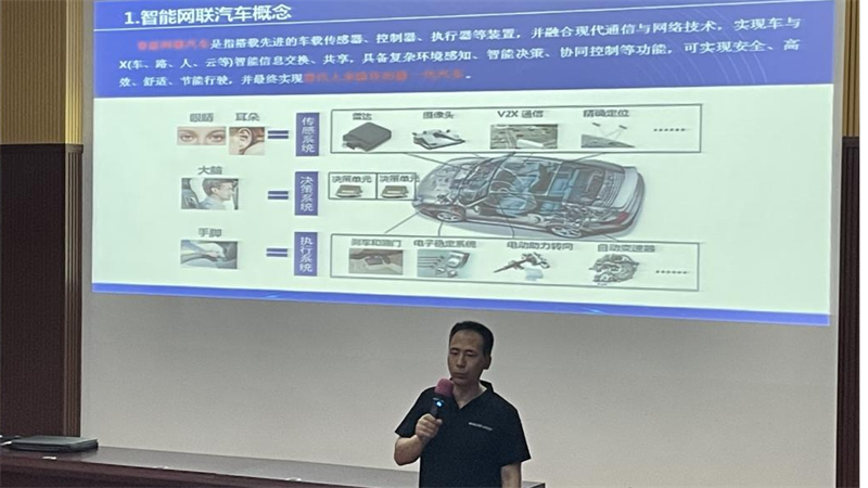 赵经理首先从“什么是智能网联汽车?”问题入手,引发各位同学的思考。赵经理向同学们阐述了智能网联汽车(Intelligent Connected Vehicle,ICV)的定义,对智能网联汽车的分级进行解释,智能网联汽车分为五级,完全自动驾驶为第五级,是无人驾驶系统的终极目标,全球仍然在探索当中。现在第三级——有条件的自动驾驶已进行商业化,如果能够被社会广泛接受,将对交通产业产生重大变革。接下来对车载传感器、控制器、执行器等装置进行拓展,打开同学们的视野,引发同学们对汽车新技术的兴趣。