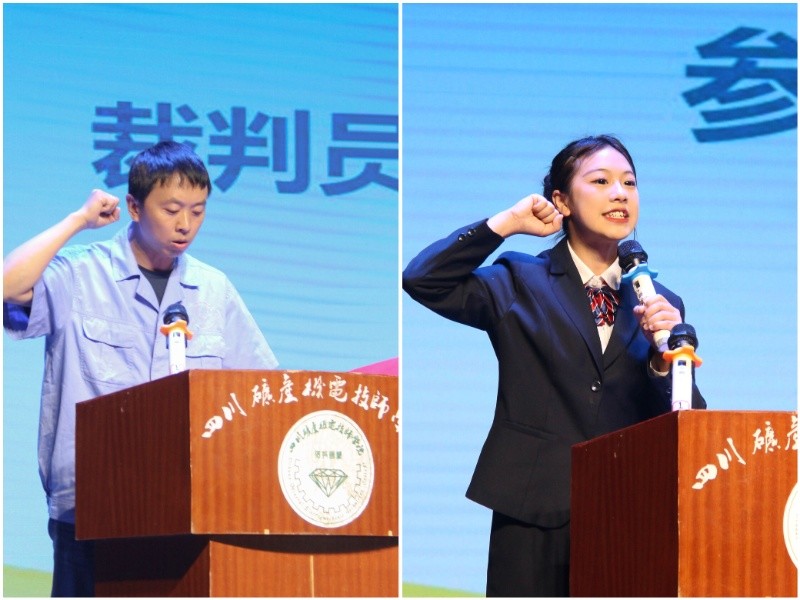 裁判员的代表何涛老师、参赛选手代表陈明秀同学分别进行了宣誓。