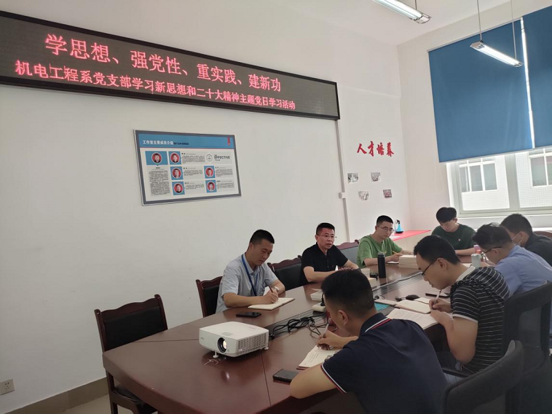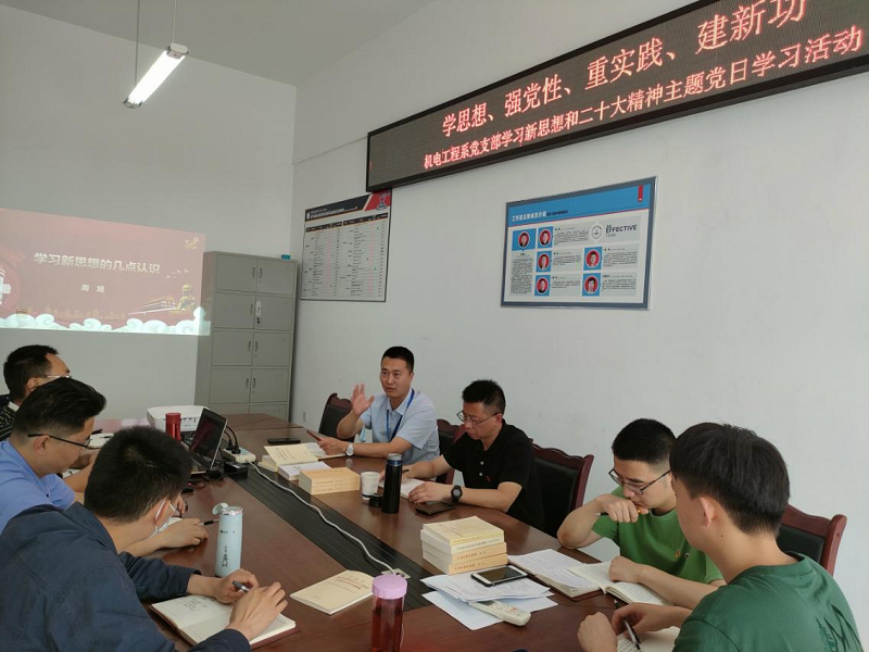按照学院党委主题教育相关要求,6月8日下午,机电工程系党支部开展了“学思想、强党性、重实践、建新功”主题党日活动。副院长董维为所有党员讲党课,共同学习新思想和党的二十大精神。活动由党支部书记周旭主持。