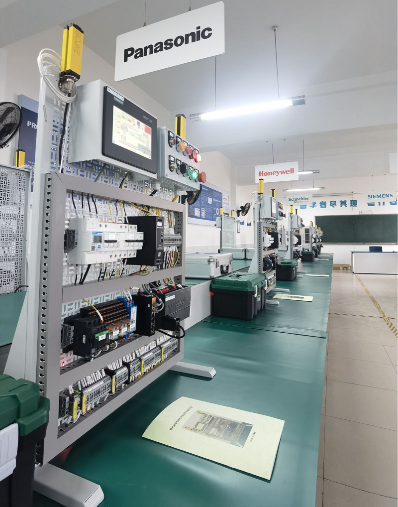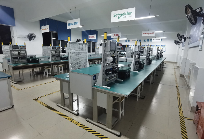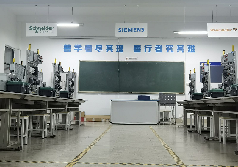 现代电气控制技术实训室拥有先进控制系统(西门子PLC、HMI、智能电表、安全光栅等)、丰富的工业自动控制现场的元器件,能够对现代工业生产设备实施产线的模拟控制调试等,共设25个工位,可供50人同时进行现代电气控制技术实训。此实训室是以现代自动控制技术、智能照明系统为建设对象,将我系“1233”专业群人才培养模式融合于实训场地,将西门子、魏德米勒、智能网联等国际化、智能化课程引入于实训平台。为机电类专业群的高质量发展奠定了良好基础。