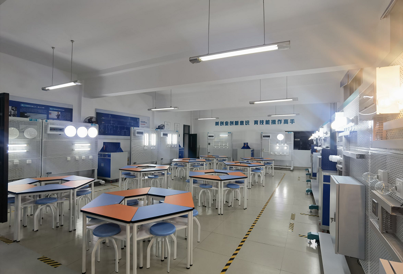 照明实训室拥有现代的智能照明系统,可进行远程控制、触摸屏控制及本地控制、智能控制面板可wifi控制、并实时查看天气状况等功能,共设48个工位,可同时进行照明线路的安装检修实训。