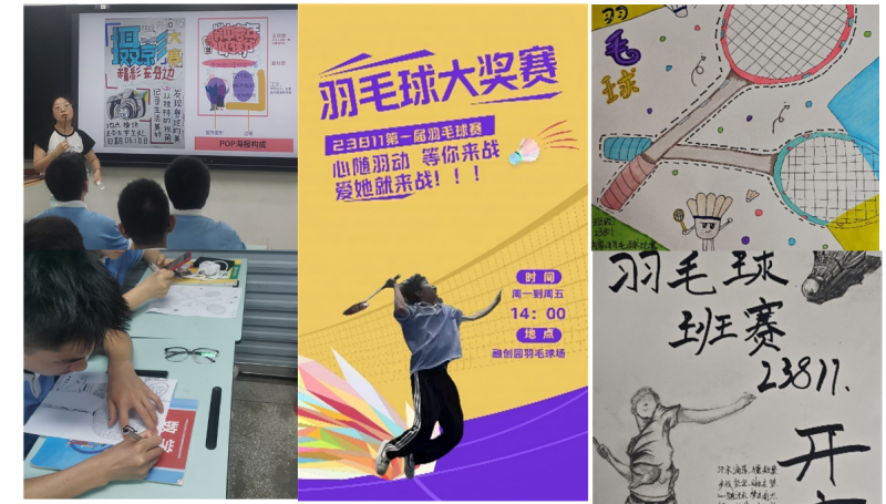 赛前,班主任让全体学生搜集羽毛球运动和羽毛球比赛的相关知识,并进行归纳整理,轮流到讲台进行讲解,鼓励学生讲解采用画图、示范、演示PPT等多种样式配合;班主任邀请课题组教美术老师的杨颖给班上了一堂《手绘海报》的专题课,发动同学们为本次比赛创作海报;还让学生“当家作主”,讨论制定本次班级羽毛球比赛的规则,并确立裁判、记录员、摄像员、后勤等工作人员。