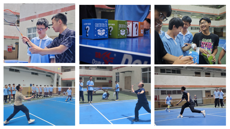 比赛分为常规(晋级)赛、复活赛、挑战赛,三个赛道交替进行。前两轮被淘汰赛的学生可以通过复活赛复活。挑战赛由学生自由挑战老师,设置了毛球水平差的班主任、爱好羽毛球的老师夏世金、羽毛球专业的老师肖晓三个难度等级。挑战成功的同学可获得开盲盒的奖励。赛中,肖晓老师还对学生们进行了专业技术指导。摄影组对每位同学的比赛都进行了拍摄,将同学们的精彩瞬间记录下来。