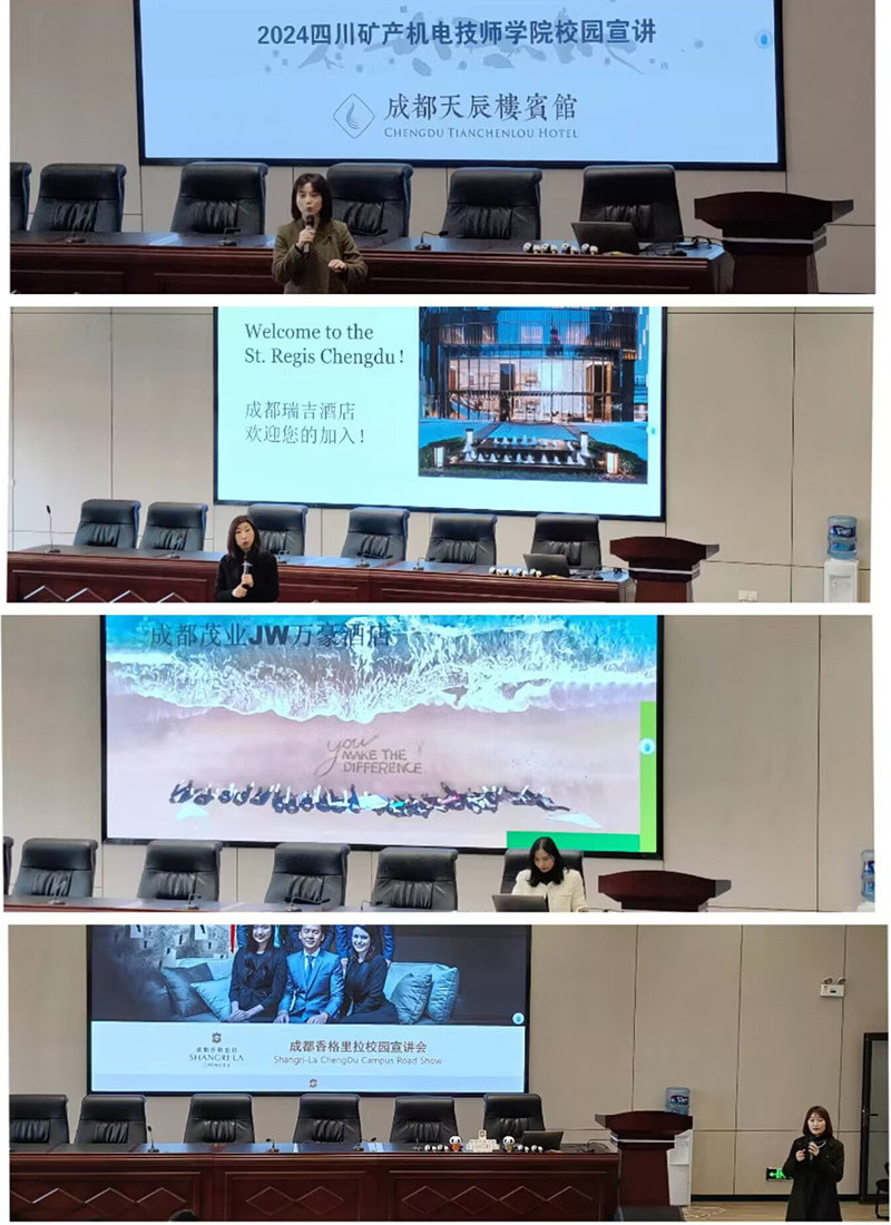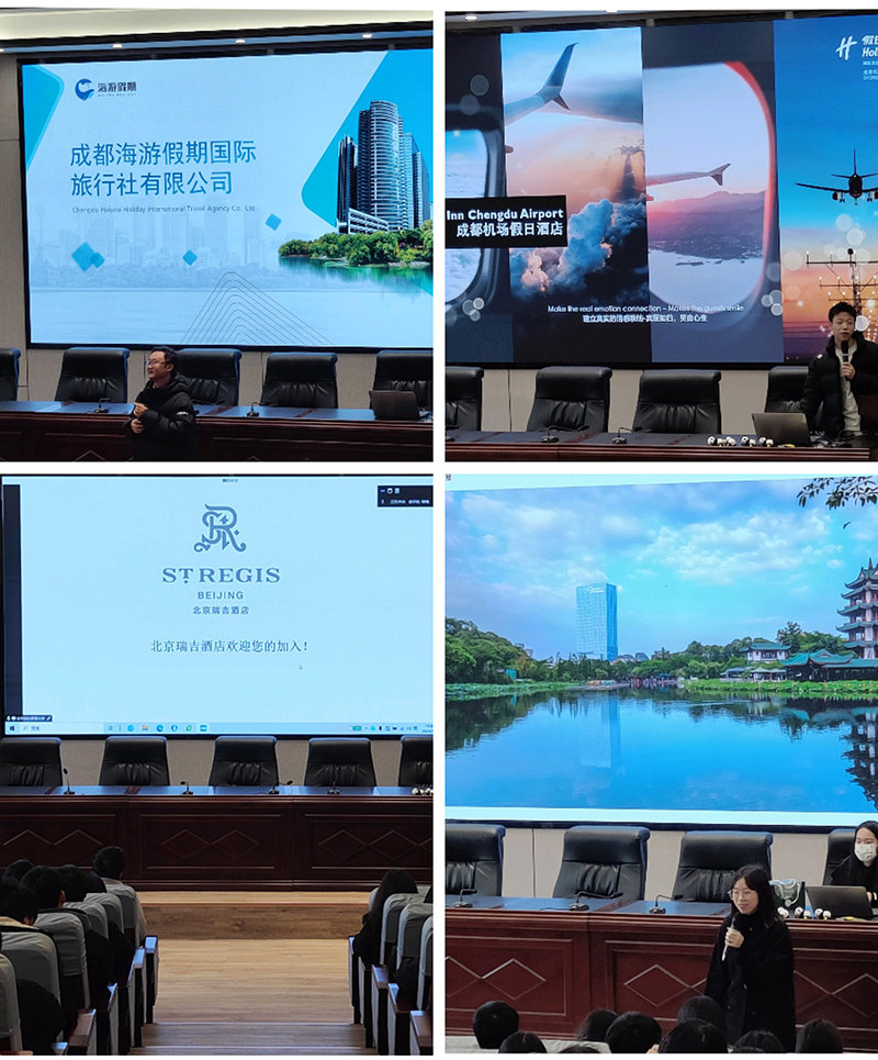 为加强校企合作,深化产教融合,1月9日下午,学院经济管理系邀请北京瑞吉酒店、成都茂业JW万豪酒店、成都瑞吉酒店、成都天辰楼宾馆,成都香格里拉大酒店、成都七一世外桃源酒店、成都机场假日酒店、成都东部新区假日酒店、成都海游假期国际旅行社九家知名企业到校开展企业宣讲招聘活动,经管系180多名学生参加宣讲。
