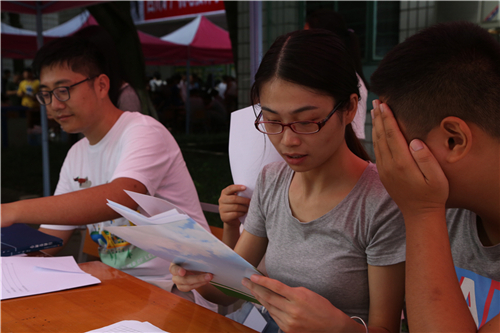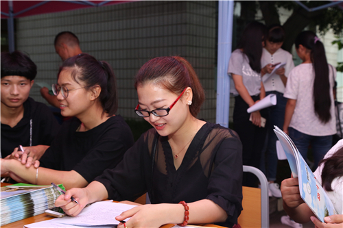 来自学院学生会、团委的学生干部担当起了接待新生的志愿者工作,他们负责引领新同学们引领新生完成报道的程序,搬运行李,前往寝室以及办理相关手续,他们打造了一条“迎新绿色通道”,成为了这炎炎盛夏的一条靓丽风景线。