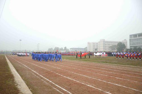 我校2011年冬季田径运动会于11月3日上午8点30分拉开序幕。在激昂的音乐声中,国旗与校运会旗首先入场,紧随其后的是团体操表演方队和广播体操表演方队,然后是各班级代表队,他们着装统一、步伐整齐,有的手举横幅标语,有的手拿国旗,喊着响亮的口号,依次走过主席台,同学们充满自信,充分展现了机电校学子意气风发,健康向上的精神面貌,为运动会增添了绚丽的色彩。