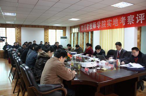 在首先召开的四川省技师学院实地考察评估工作会上,省人社厅带队领导张影红主任介绍了评估组的六位专家情况和国家开办技师学院的背景,并对评估工作提出了相应要求;我校主管局江元生副局长致词,对各位省厅领导和评估组专家表示热烈欢迎,感谢他们多年来对学校的指导和帮助,期望学校能跨上一个新的台阶;学校林校长紧接着从学校概况和办学目标明确,办学规模稳定等六个方面,围绕十二条评估细则,就我校申办四川省资源工程技师学院情况进行了详细汇报。到会的还有我校主管局人事教育处刘果莲、黄劲松两位处长,学校党委书记徐振川、教务副校长肖前蔚、总务后勤副校长孙家鸣,以及学校中层干部等。