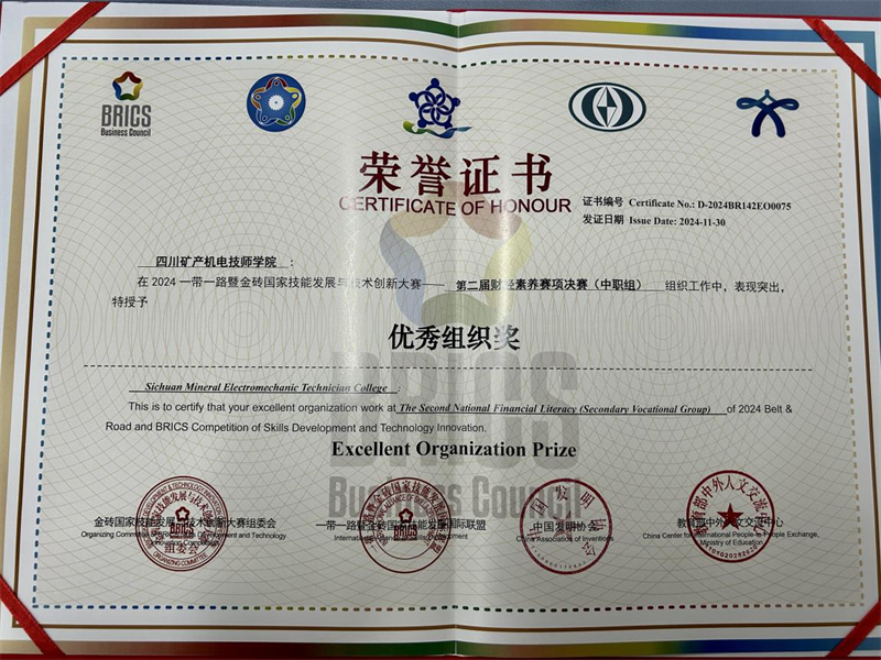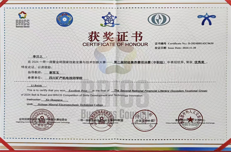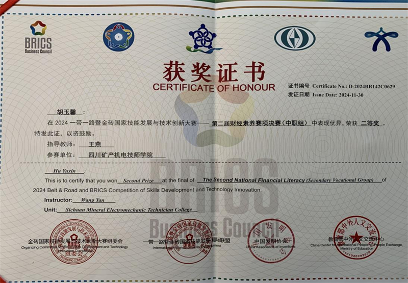 近期,“2024‘一带一路’暨金砖国家技能发展与技术创新大赛”第二届财经素养赛项决赛全国总决赛成功举办。我院2023级会计专业学生胡玉馨、李贝之在决赛中经过激烈角逐,分别荣获国内中职组二等奖和优秀奖,学院被授予“优秀组织奖”,王燕老师荣获“优秀指导教师”。