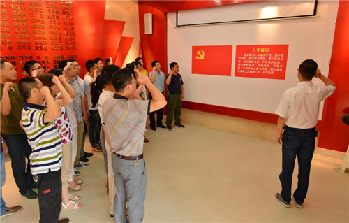 随后,学院党委书记徐振川带领全体党员在党旗下面重温入党誓词,宣誓坚定有力,展现了大家永远跟党走的决心。接下来,预备党员梅磊同志在二支部组织委员张磊同志的带领下在党旗下面进行了入党宣誓,教学二支部又输入了新鲜的血液。最后全体党员在纪念馆面前合影留念。