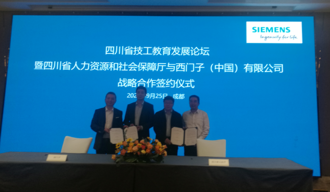 9月25日,学院院长林仕发、副院长董维、机电工程系主任周旭一行三人受邀参加了由四川省人社厅与西门子(中国)有限公司联合主办的四川省技工教育发展论坛暨四川省人社厅与西门子(中国)有限公司战略合作签约仪式。