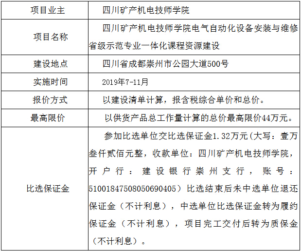 四川矿产机电技师学院计划对电气自动化设备安装与维修省级示范专业一体化课程资源进行建设,根据有关法律法规的要求,通过内部比选确定服务单位,诚邀符合条件的三家(含三家)以上的申请人参与本项目的比选。
