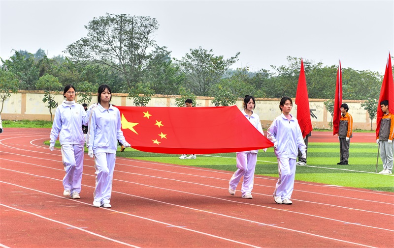 清风徐徐,初冬的崇州西江绿意不减,河畔的四川矿产机电技师学院运动场内气氛热烈。伴随着激昂的《运动员进行曲》,护旗方队迈着矫健的步伐护送国旗率先入场,表演方队、裁判员方队、来自局机关和局属单位的15支篮球运动员方队紧随其后有序入场。在雄壮国歌声中,五星红旗冉冉升起。