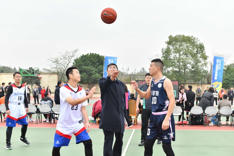 局党委副书记刘健为首场比赛开球后,省地质局首届“地质杯”职工篮球友谊赛正式开始。