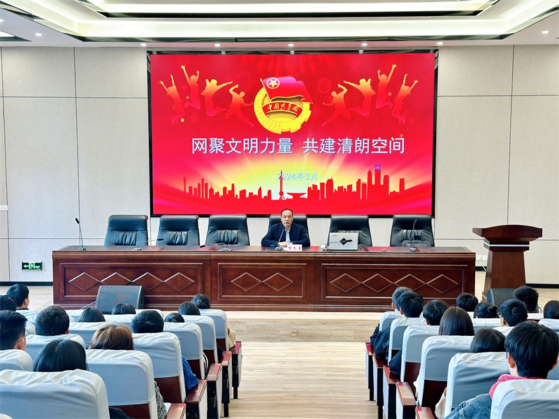 黎文勇指出,院党委高度重视网络意识形态安全,随着时代发展,网络成为我们学习、工作的重要工具,覆盖日常生活的方方面面,网络文明也成为新时代社会文明的重要内容,倡导文明新风,共建清朗空间,是立德树人的重要举措,也是维护学院意识形态领域安全的必要举措。他对同学们提出三点希望:一是文明上网,严格遵守法律法规。不发布和传播违反国家法律、影响国家安全、破坏社会稳定的新闻和信息,不编造、传播虚假消息或转发未经证实的可能会给社会或他人造成伤害的信息,不做“按键伤人”的“键盘侠”。二是安全上网,增强信息辨别能力。要增强网络安全防范意识,不随意打开不明网站,不浏览不良网站,不要轻易在网上透露个人隐私和重要身份信息,在网上交友要谨慎,切勿涉及钱财,更不能随便与网友见面。三是自律上网,坚决抵制网络沉迷。要正确处理好上网与学习、生活的关系,善于网上学习、适度网上娱乐,养成健康上网的习惯,主动将自己从虚拟时空中“解放”出来,多参加体育锻炼,多进行真实的人际交往。