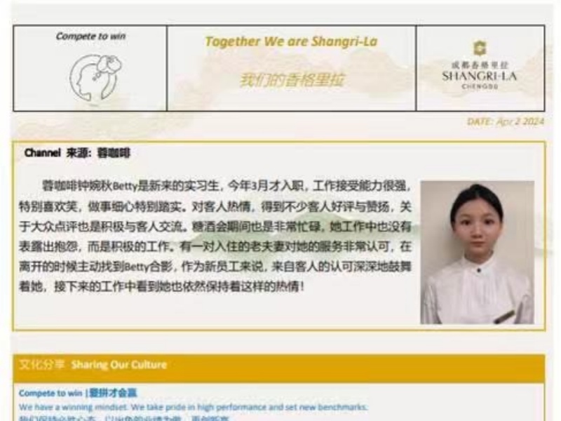4月2日,成都香格里拉大酒店举行了一场特别的表彰,对实习期间表现优异的实习生进行了嘉奖,学院经济管理系旅游服务与管理专业2022级学生钟婉秋,凭借出色的工作能力和优质的服务,获得了企业的认可,成为了同学们学习的榜样。