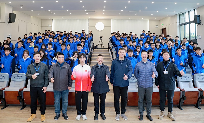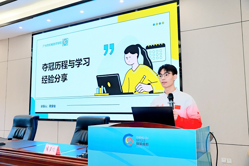 蒋家俊以《夺冠历程与学习经验分享》为主题,和在场的同学们分享个人学习经验、备赛与竞赛经历、职业规划等,并就专业学习、技能比赛等方面为同学们进行答疑解惑。他说,作为技能人才不仅是拥有一技之长,更肩负着推动国家发展、社会进步的重要使命,他鼓励学弟学妹们明确职业目标、积累实践经验,在技能道路上不断追求极致、精益求精。