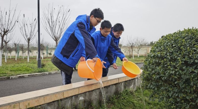 活动中,师生迅速投入到志愿服务活动中,他们手持水盆、水桶等盛水工具,分组行动,有的负责给校园内的树木花草浇水,有的负责清理花坛里的杂草和垃圾。大家分工明确,配合默契,一片热火朝天的景象。