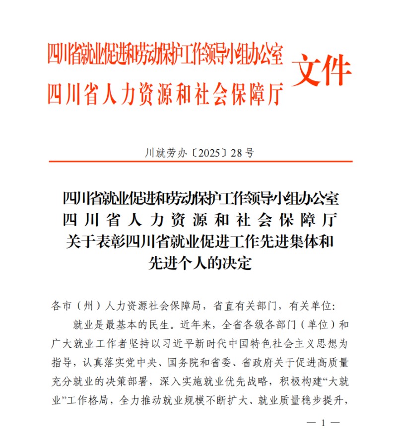 近日,四川省就业促进和劳动保护工作领导小组办公室、四川省人力资源和社会保障厅联合印发《关于表彰四川省就业促进工作先进集体和先进个人的决定》,学院成功获评“四川省就业促进工作先进集体”,成为唯一一所获此殊荣的技工院校。