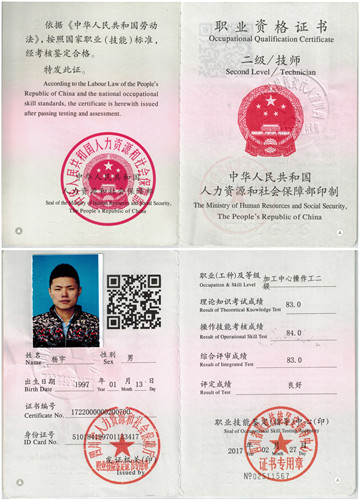 经四川省第44届世界技能大赛四川省选拔赛组委会和四川省职业技能鉴定指导中心确认,我院学生杨宇、李成贵由于在第44届世界技能大赛四川省选拔赛中的优异表现并取得优异成绩,根据相关规定,两位同学获得直接晋升技师职业资格,目前,技师职业资格证书已发放至两位学生手中。