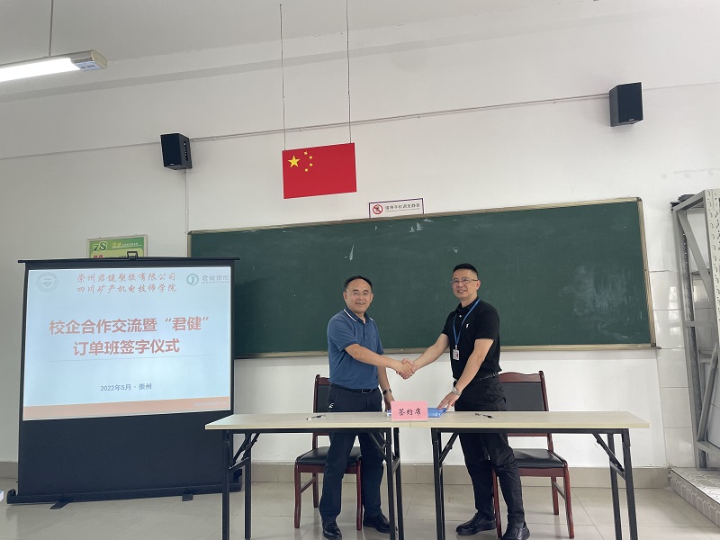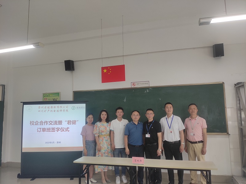 5月10日,我院在机电工程系“成都市工业控制集训基地”与崇州君健塑胶有限公司举行“君健订单班”签字仪式。君健塑胶副总经理肖弘渊、人事部部长杨潇,学院副院长董维、机电工程系主任周旭、副主任杨唯参加签字仪式。