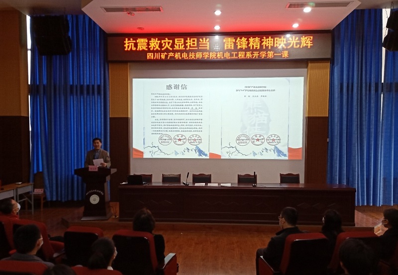 活动由周旭主持并发言,他指出在2022年9月5日12时52分,四川省甘孜藏族自治州泸定县发生了6.8级强烈地震,给灾区人民生命财产和经济社会发展造成重大损失。危难之际,我院机电工程系曾楠、文义杰、罗维兵3位学子在得知灾情后,不惧个人安危,不计个人得失,毅然决然的加入到抗震救灾的洪流当中。不啻微芒,造炬成阳,他们与千千万万参与救灾的志愿者,汇聚起不可战胜的磅礴力量。
