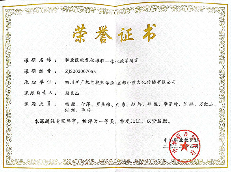 近日,经中国职工教育和职业培训协会评审,由学院正高级讲师赖良杰领衔申报的课题《技工校电商人才培养对接“一带一路”的研究》在中国职协优秀教科研成果征集评选活动中,荣获科研课题二等奖;由学院及校企合作企业成都小钦文化传播有限公司联合申报的国家级课题《职业院校礼仪课程一体化教学研究》,经中华职业教育社评审荣获一等奖。