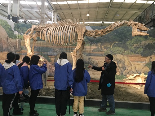 一进入天演博物馆的大门大家就被映入眼帘的恐龙化石群所震撼,不由自主的发出感叹的声音。博物馆分两层,分别陈列了各类古生物化石如恐龙化石、披毛犀化石及完美的海百合化石等,还有各类大型矿物晶体、各类木雕等,同学们对这些都感到特别新奇。在解说员的指引下,大家怀揣着求知的欲望跟着解说员观看完博物馆陈列的所有展品,感悟大自然的美妙与神奇。