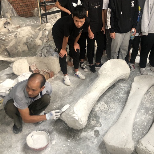 同学们先是来恐龙展厅观看了恐龙模型,很多同学都是第一次来天演博物馆,被眼前来自侏罗纪的恐龙化石震惊到了。它们形态各异,极大提升了同学们的学习兴趣,对自己今后要从事的工作也热爱了起来。我们跟随王馆长的脚步,来到天演博物馆各个工作间,有上色的,有塑形的,还有做拼装的。每个工种都不一样,同学仔细观摩着,被各个匠人所吸引。