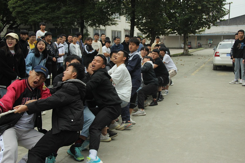 拔河赛场上,随着哨声响起,队员们口中一齐高呼着:“一二、一二”,双手紧握长绳,憋足了劲拼命往后拉,老师们也在队伍旁边助阵加油,其余同学自发组织为本班人员呐喊助威。号子声、呐喊声,此起彼伏,飘荡在赛场上空。
